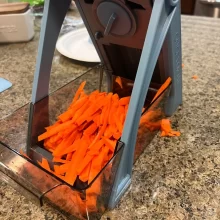 We adore this mandolin. Its assembly is straightforward, and it simplifies vegetable slicing. The suction cups keep it steady, and switching functions is a breeze. We’ve recommended it to friends and family."